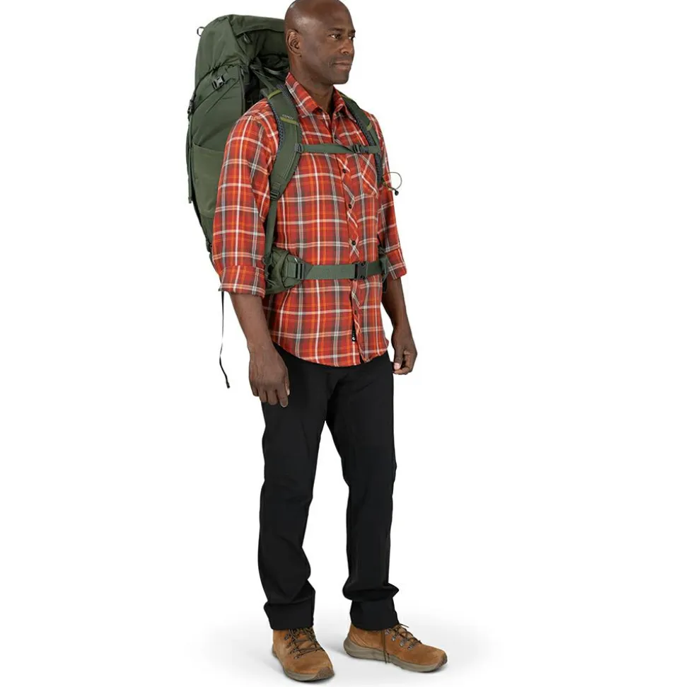 Osprey fertigt den Trekkingrucksack als Toploader mit Deckelfach, Frontfach und seitlichen Fächer. Zusätzlich stehen diverse Kompressionsriemen, Befestigungsmöglichkeiten für Trekkingstöcke, sowie Daisychains und weitere Fixpunkte bereit. Das große Hauptfach lässt sich von oben, oder durch den langen Reißverschluss an der Seite erreichen. So lässt sich die Ausrüstung jederzeit bestens organisieren und verstauen.