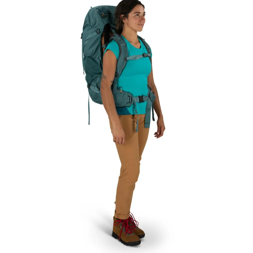 Der hochatmungsaktive AirSpeed Netzrücken reduziert das Schwitzen auf ein Minimum und lässt sich individuell auf verschiedene Oberkörperlängen anpassen, um eine optimale Lastenverteilung zu gewährleisten. Zusammen mit dem angenehm leichten LightWire Rahmen und dem gepolsterten, frauenspezifischen Tragesystem entsteht so ein hervorragender Tragekomfort. Die praktischen Hüftgurttaschen und das separate Schlafsackfach runden das durchdachte Design ab und machen den Renn 50 von Osprey zum perfekten Begleiter für den Trail!
