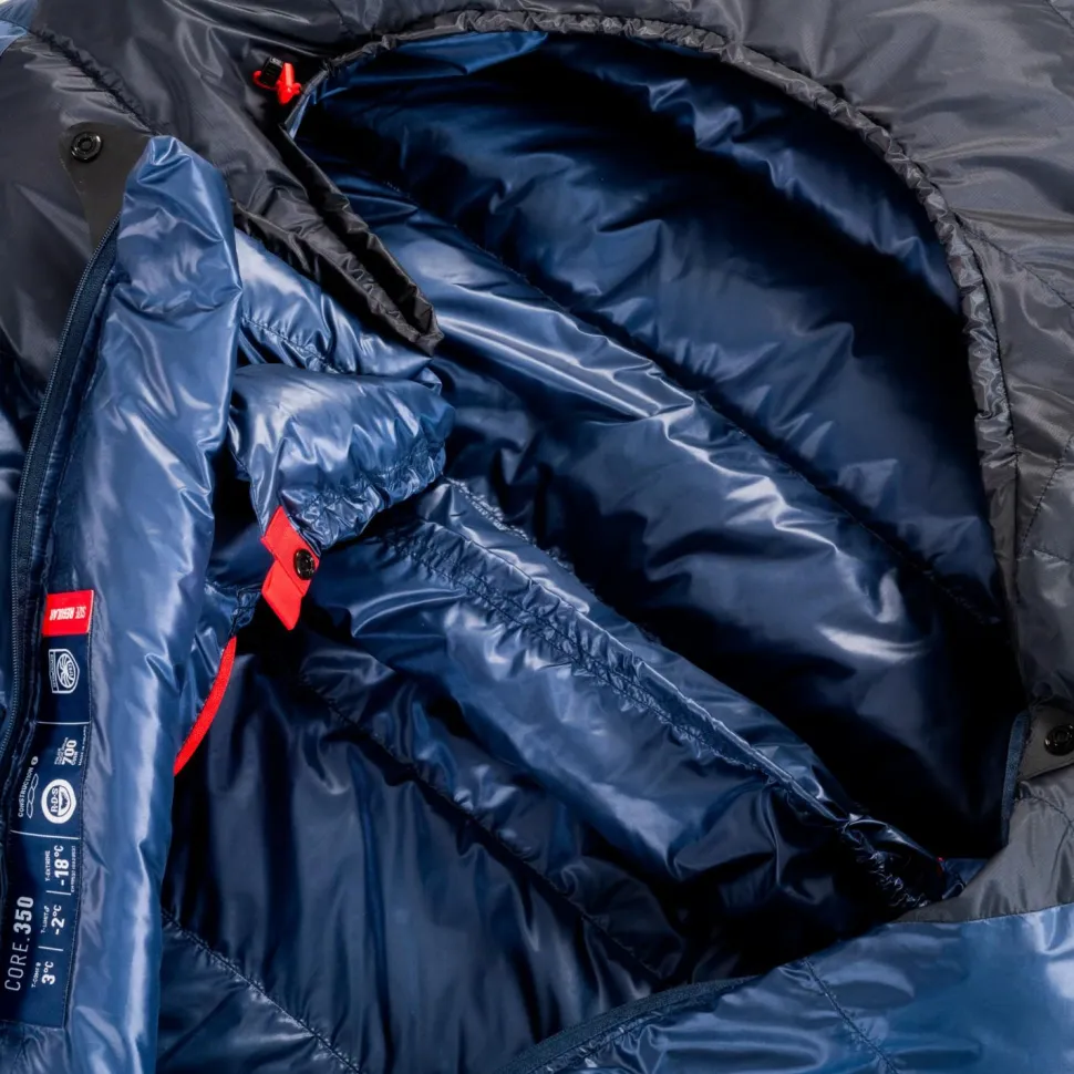 Das Außenmaterial besteht aus PFC-frei imprägniertem Polyamid für Schutz und Langlebigkeit. Der bequeme Mumienschnitt sorgt für eine gute Balance aus Bewegungsfreiheit und Wärmeeffizienz. Ein gefütterter Wärmekragen verhindert das Eindringen von Kälte, während die Innentasche mit Reißverschluss Platz für Wertsachen oder ein kleines Licht bietet.