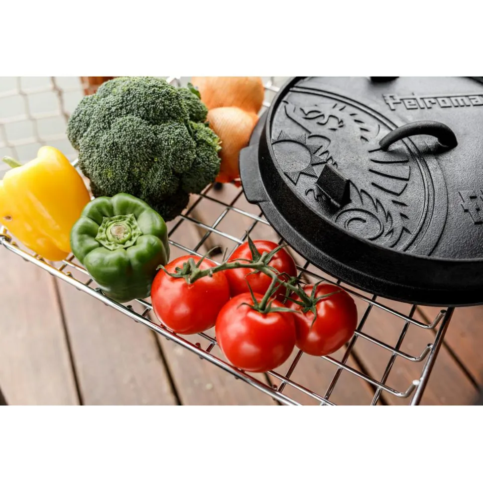 Der verchromte Ablagekorb aus Stahl ist nicht nur robust, sondern dient Dir auch als Ablage für Deinen Feuertopf oder Deine guss- oder schmiedeeiserne Pfanne mit einer Traglast von bis zu 15 kg. So hast du die Hände frei, wenn Du Briketts wechseln oder Deine Feuerstelle neu entfachen möchtest.