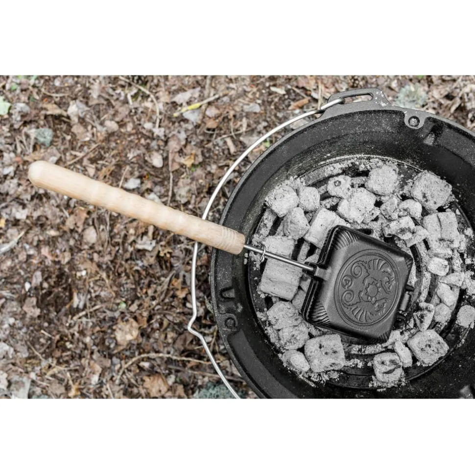 Ein gelungenes Essen garantiert das Sandwich-Eisen von Petromax! Der Verschlusshaken hält die Hälften der Eisen sicher zusammen. Die Materialeigenschaften des Gusseisens ermöglichen sowohl das Anbraten als auch das Nutzen der Restwärme zum Ausbacken oder Garen. Der Stiel hält Deine Hand in sicherem Abstand zum Feuer.