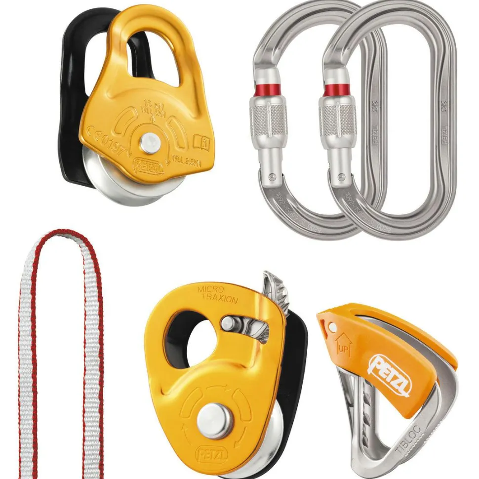 Ein Rettungskit wie das Kit Secours Crevasse von Petzl ist auf Hochtouren mit oder ohne Ski unverzichtbar. Es dient bei der Spaltenbergung zum Einrichten eines Flaschenzugs, zur Selbstrettung oder zum Aufstieg am Seil.
