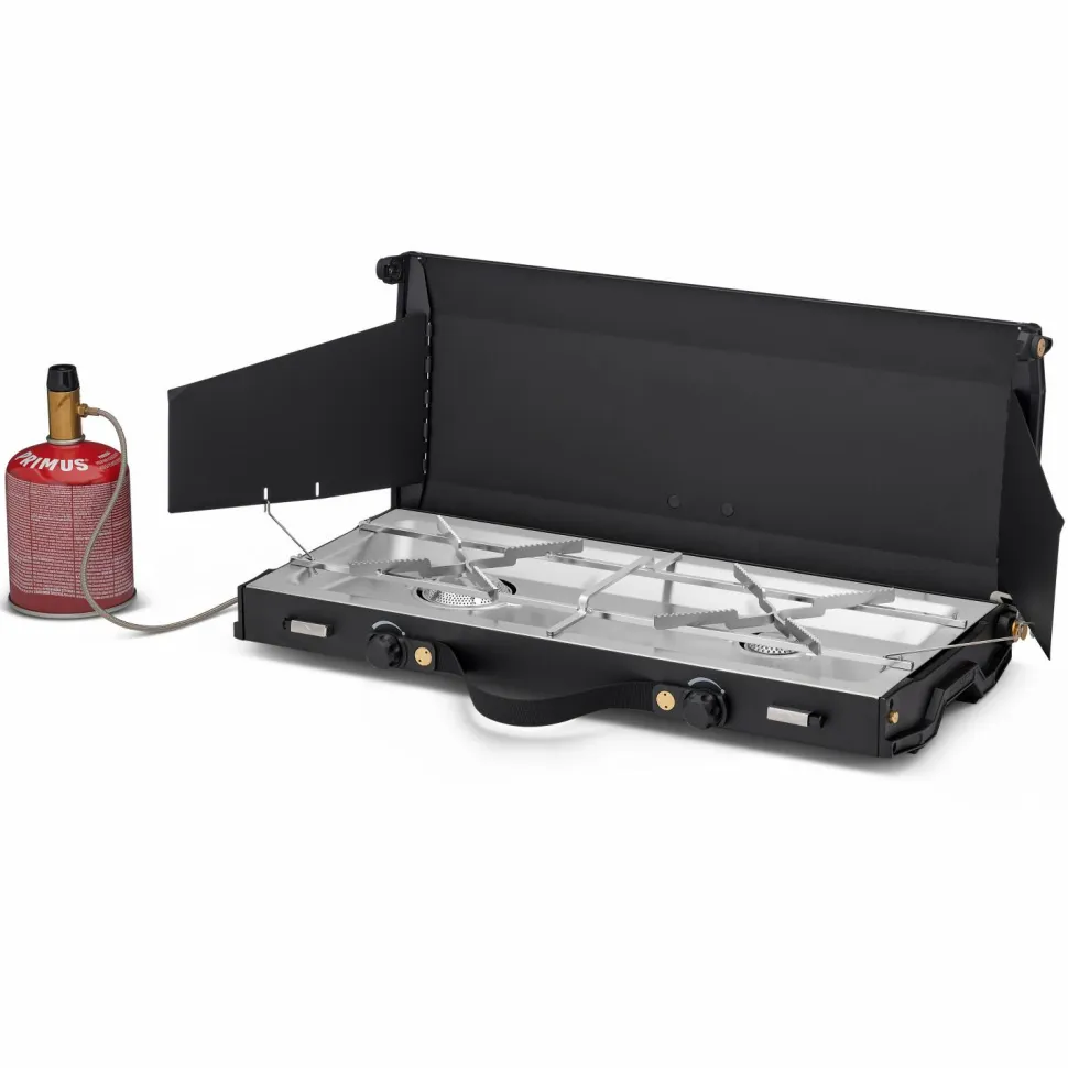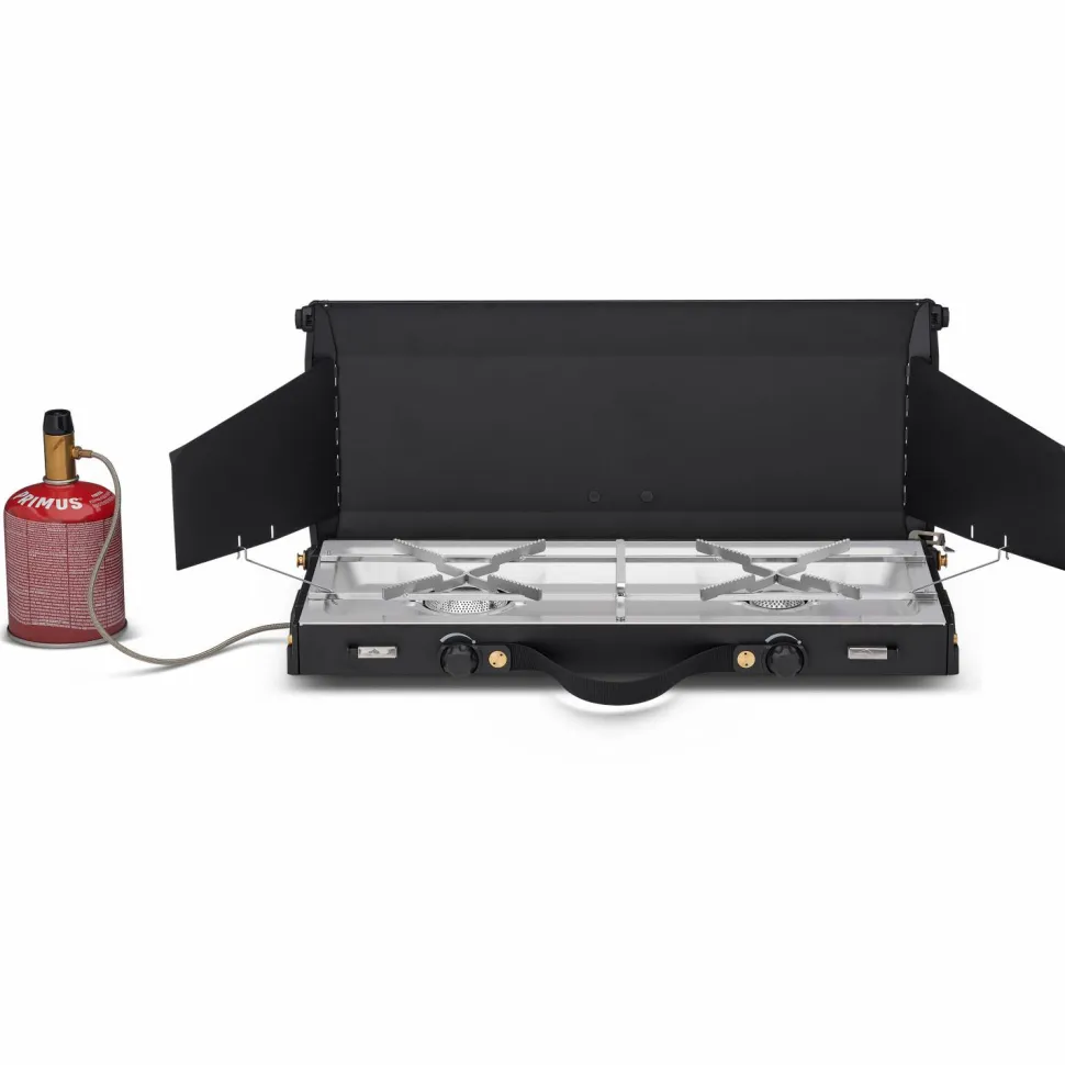 Ideal, um die ganze Familie zu verpflegen: der Alika Stove von Primus! Der Zweiflammkocher besitzt eine großzügige Kochfläche, auf der problemlos zwei Töpfe oder Pfannen mit einem Durchmesser von 28 cm Platz haben. Durch die integrierte Piezozündung lässt sich der Kocher bequem per Knopfdruck anzünden. Die unterschiedlich starken Flammen bieten eine Leistung von bis zu 3900 Watt und sind individuell regulierbar, sodass Du Hauptgericht und Beilage zeitgleich zubereiten kannst.