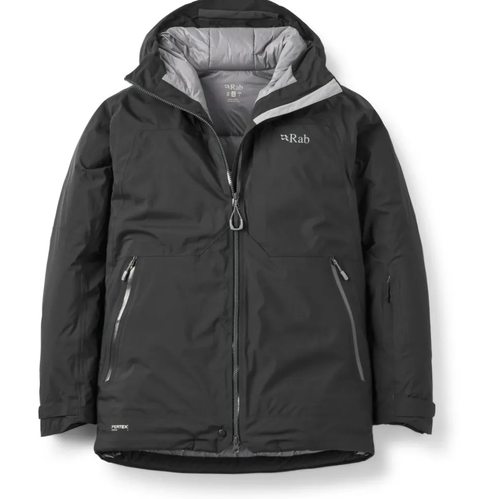 Die helmtaugliche Kapuze ist mit ihren verdeckten internen Kordelzügen einhändig verstellbar. Der zuverlässige und leichtgängige YKK VISLON Frontreißverschluss ist wasserfest und mit einer innen liegenden Sturmblende verstärkt. Mit seiner 2-Wege Funktion vereinfacht er die Handhabung eines unter der Jacke getragenen Klettergurts.