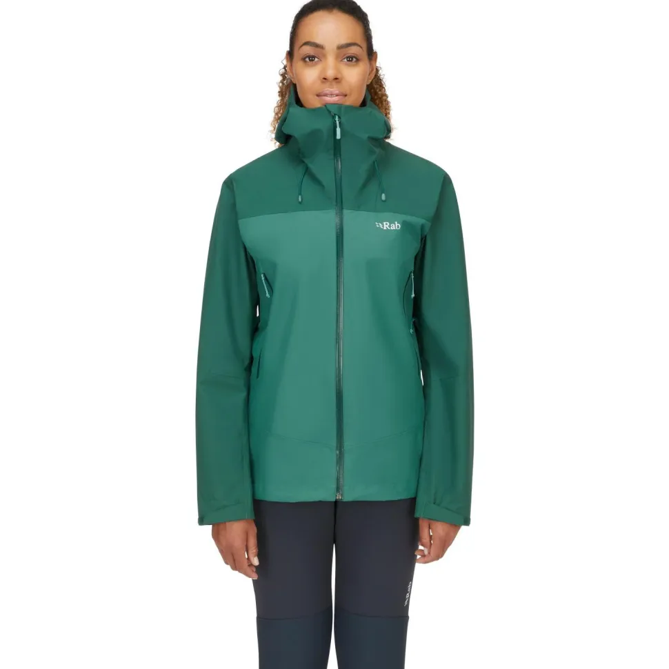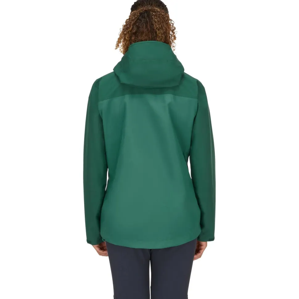 Durch das geringe Gewicht und das platzsparende Packmaß ist diese vielseitige Regenjacke auf jeder Tour mit dabei – die Women’s Arc Eco Jacket von Rab! Bei Nichtgebrauch kann die Hardshelljacke in einer der beiden Brusttaschen komprimiert werden. Die Kapuze lässt sich über beidseitige Kordelzüge individuell an den Kopf anpassen und schützt dank des verstärkten Schirmes gegen den Regen. Um die Ventilation der Outdoorjacke zu erhöhen, sind Belüftungs-Reißverschlüsse unter den Armen integriert. Durch die Klettverschlüsse an den Ärmeln und den Kordelzug im Saum lässt sich die Jacke jederzeit bequem an den Oberkörper anpassen.
