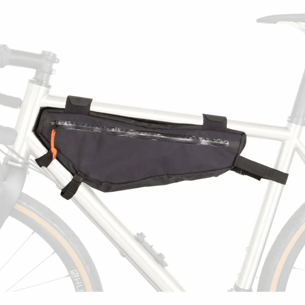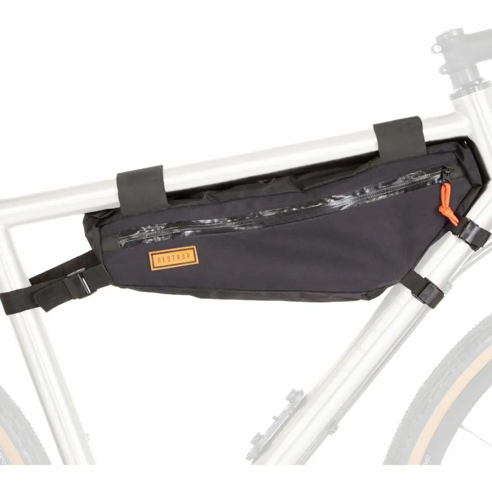 Die Frame Bag Medium von Restrap wird der neue beste Kumpel des Tourenrads. Mit seinen robusten Materialien erlaubt die Tasche einen sicheren Transport von Gegenständen, die unterwegs nicht nass oder dreckig werden sollen. Zudem sind die transportierten Utensilien jederzeit griffbereit, denn die Tasche ist mit einem robusten Reißverschluss ausgestattet. Im Innern lässt sich das Gepäck einfach organisieren, denn es ist eine Mesh-Tasche integriert. Zudem können Dokumente in eine speziell hierfür vorgesehene Tasche gesteckt werden. Befestigt wird die Rahmentasche mit beschichteten Riemen, um Kratzer am Rahmen zu vermeiden.