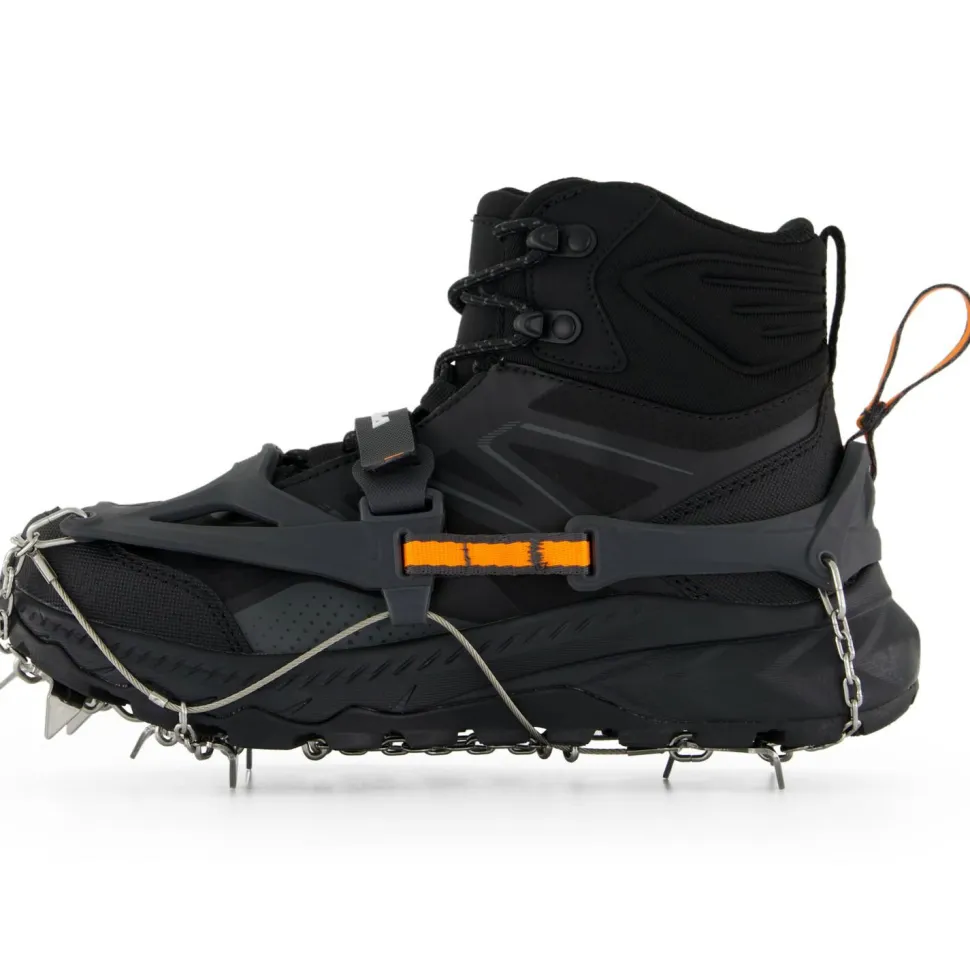 Der strapazierfähige Gurt ist mit einem Klettverschluss ausgestattet, der eine präzise Anpassung der Kabel im Vorder- und Mittelfußbereich ermöglicht und so eine gut umfassende Passform am Schuh gewährleistet. Dank der Anziehschlaufe an der Ferse lassen sich die Grödel schnell über- und abziehen.