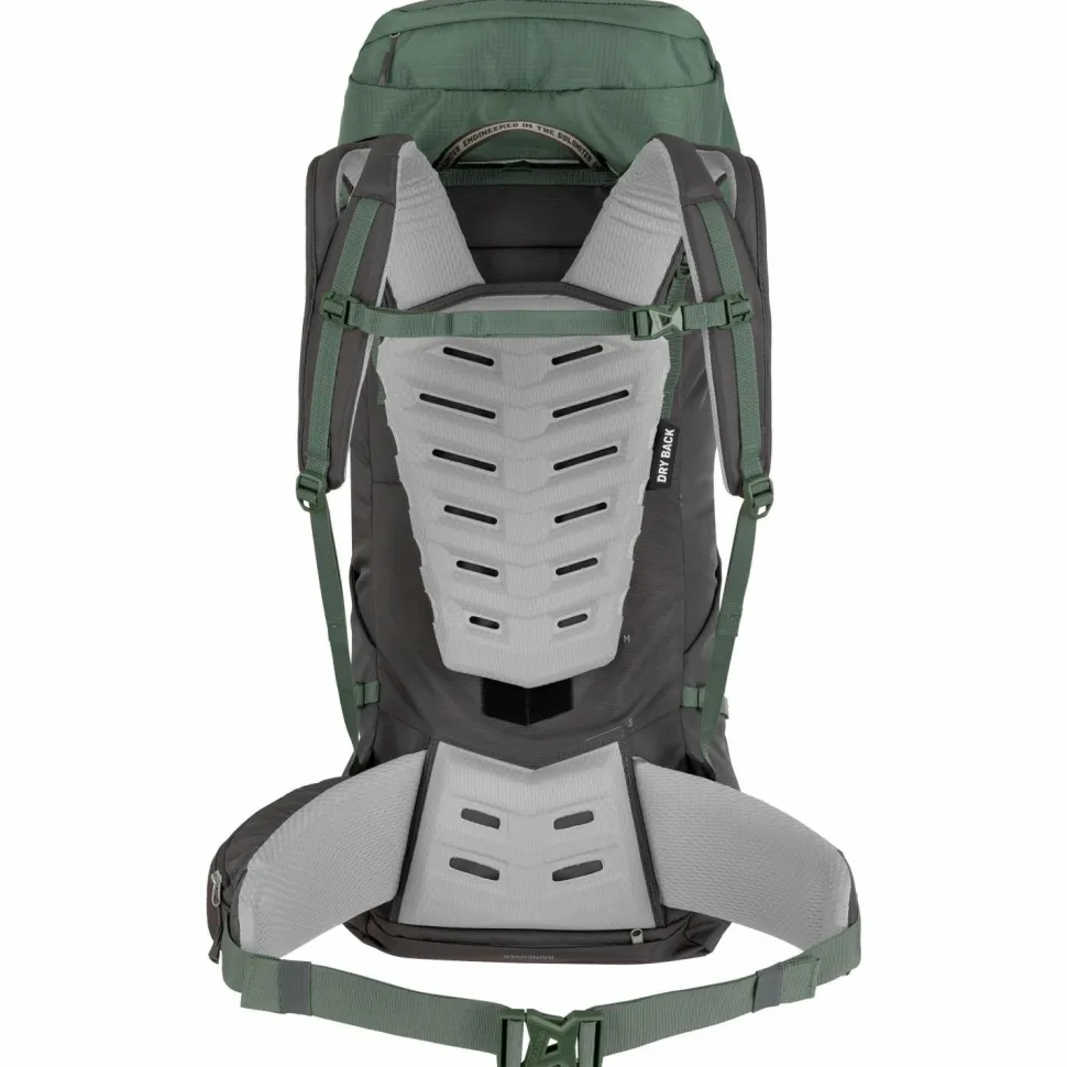 Der Rucksack bietet, mit einem Volumen von bis zu 70 Litern, viel Platz für Ausrüstung. Das große Hauptfach kann von oben sowie von der Seite erreicht werden. Dies ist besonders praktisch, wenn tief verstaute Utensilien erreicht werden müssen. In weiteren Fächern wie einem Boden-, Deckel- oder Frontfach findet weiteres Gepäck Platz. In einer mir Reißverschluss verschließbaren Hüftgurttasche kann schnell zu erreichender Kleinkram verstaut werden. Schulter-, Hüft- und Brustgurt verteilen die Last gleichmäßig auf den Oberkörper. Zudem sorgt das DRY BACK CUSTOM Tragesystem für ausreichend Frischluft am Rücken.