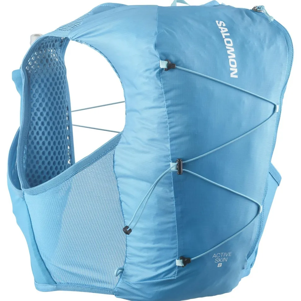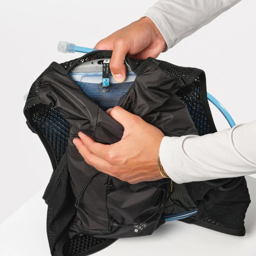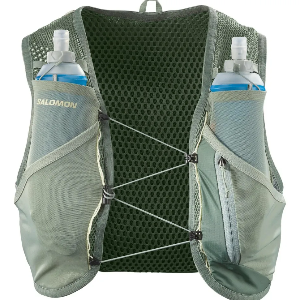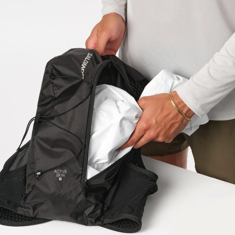 Bei der Active Skin 8 Set von Salomon handelt es sich um eine Laufweste, die sich auf das Wichtigste beim Running konzentriert. Sie ist leicht und kommt mit einem Volumen von 8 Litern, was ausreichend Platz für die nächste Laufeinheit ist. Sie bietet eine praktische Flüssigkeitsversorgung – dank der beiden Soft Flasks, die im Lieferumfang mit enthalten sind. Diese liegen einfach in der Hand, damit man mühelos trinken kann, wenn das Durstgefühl aufkommt. Die Tasche bietet schnellen Zugriff auf Energy-Gels und andere Kleinigkeiten, während die Laufweste zahlreiche Stockhalterungslösungen bietet und einen Schlüssel-Clip. Mit dem Active Skin 8 Set sind Trailrunner bestens ausgestattet fürs nächste Abenteuer!