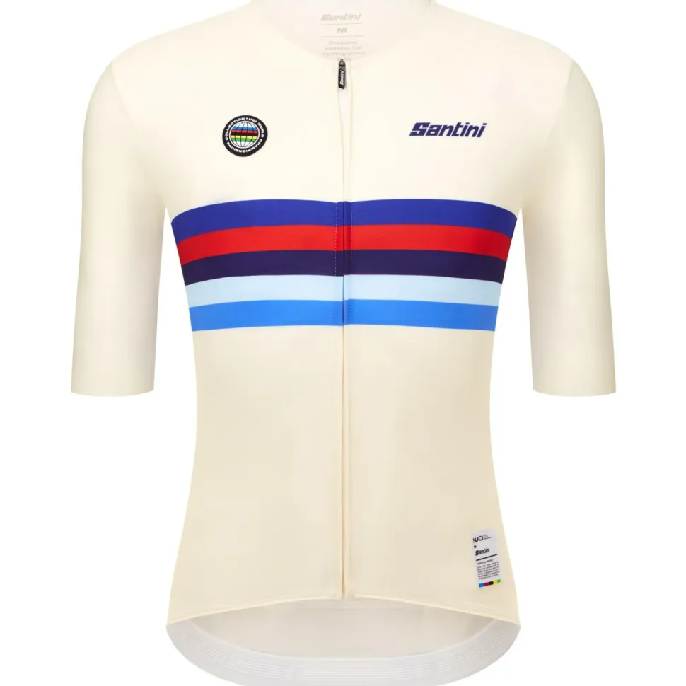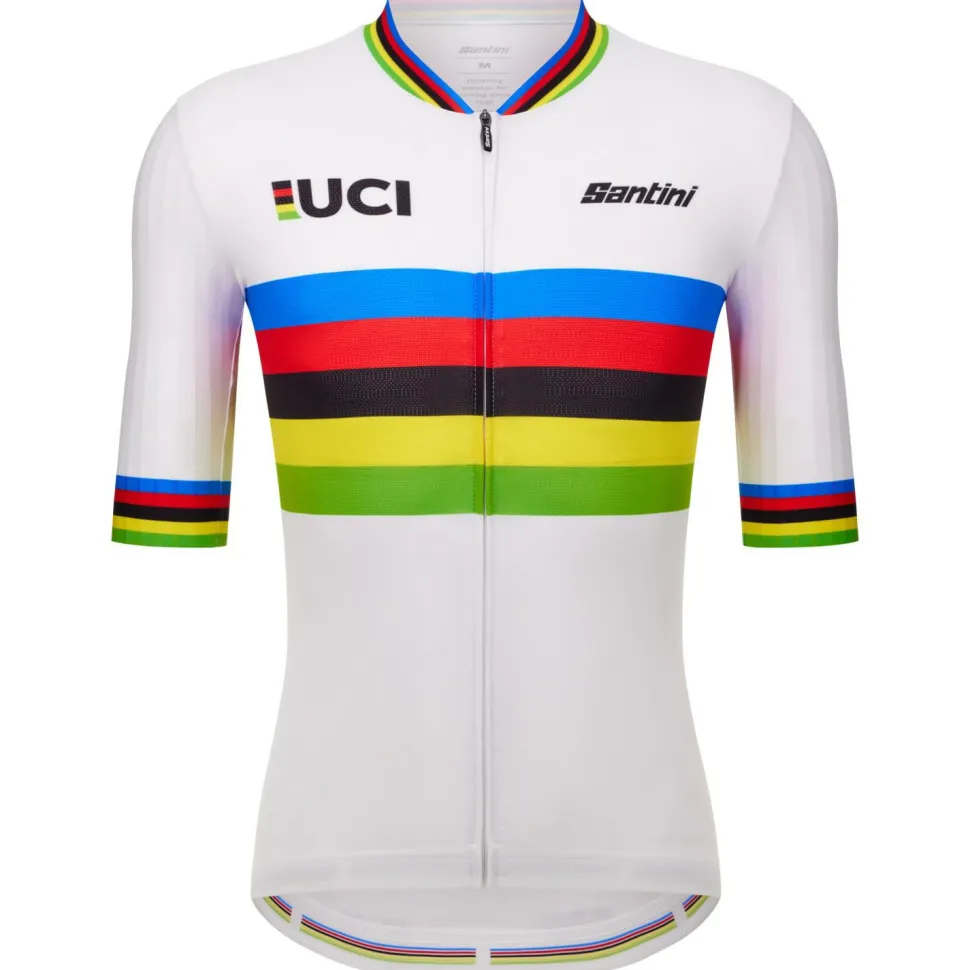 Als klassisches Radtrikot mit sportlichem Schnitt begeistert das UCI World Champion Jersey Radtrikot von Santini beim Training mit dem Roadbike. Dafür bietet das Rennradtrikot hervorragende Beweglichkeit, tolle Atmungsaktivität und zuverlässigen UV-Schutz mit Lichtschutzfaktor UPF 30. Drei praktische Rückentaschen, ein kurzer Stehkragen und ein durchgehender Frontreißverschluss ergänzen das hübsche Shirt. Als optisches Highlight unterstreichen die Regenbogenfarben am Hals und am Oberkörper den weltmeisterlichen Look.