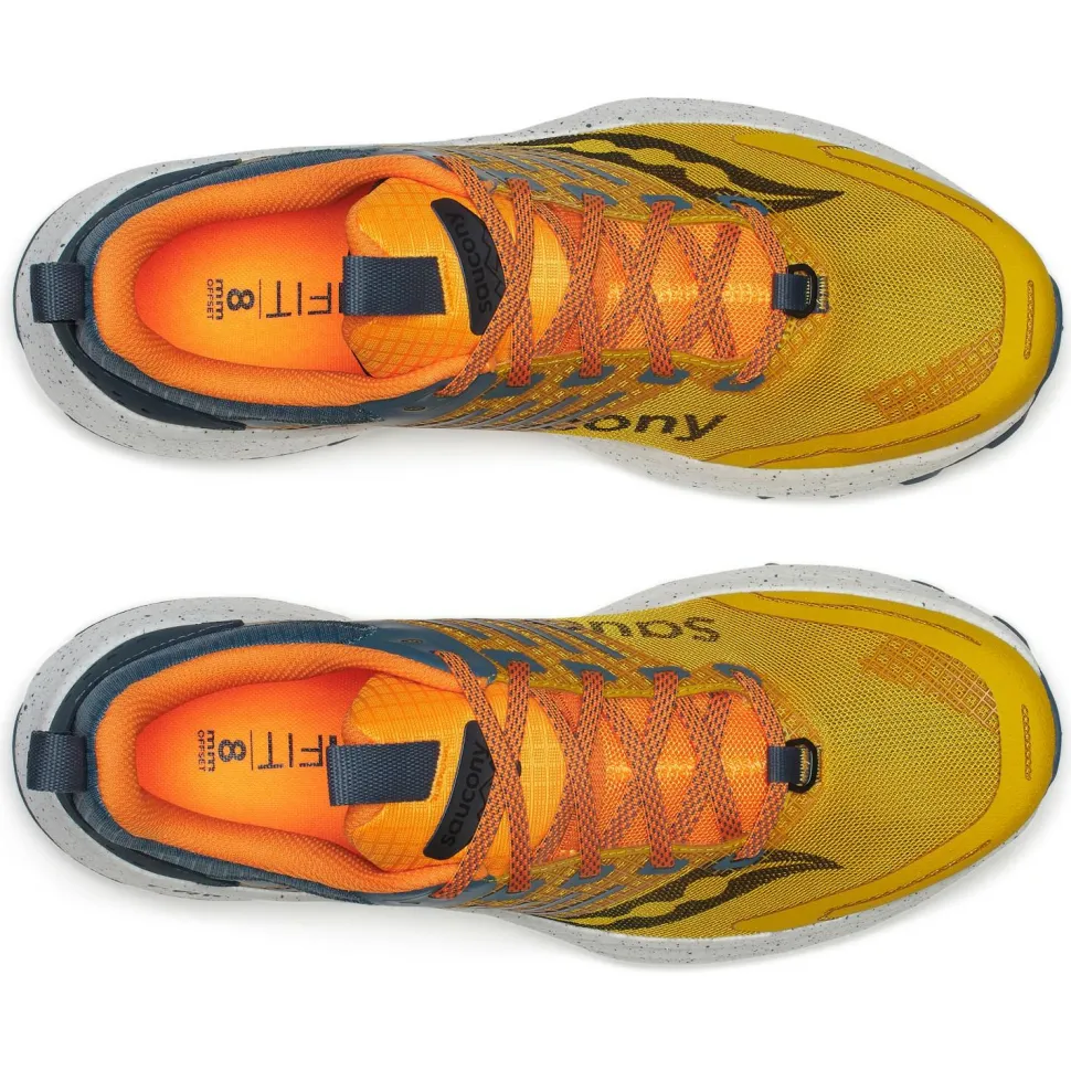 Die Saucony Ride TR2 sind vielseitige Trailrunningschuhe mit weicher Dämpfung und All-Terrain-Profil. Sie eignen sich ideal für Trainingsrunden von der Haustür weg in den Wald. Mit den 3,5 mm tiefen Noppen kommst Du sowohl auf Asphalt als auch auf trockenen Trails klar. Das hohe Profil mit 35 mm im Fersenbereich und dem PWRRUN+-Schaumstoff sorgen für weiche Landungen und Komfort auch auf langen Strecken. Die Laufsohle besteht aus abriebfestem und griffigem Gummi, für guten Grip auf allen Untergründen. Das robuste und zugleich luftdurchlässige Mesh-Obermaterial bietet Schutz und Belüftung.