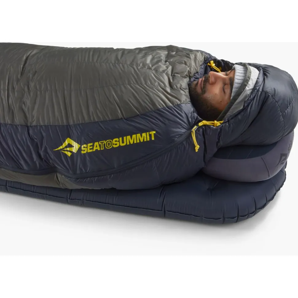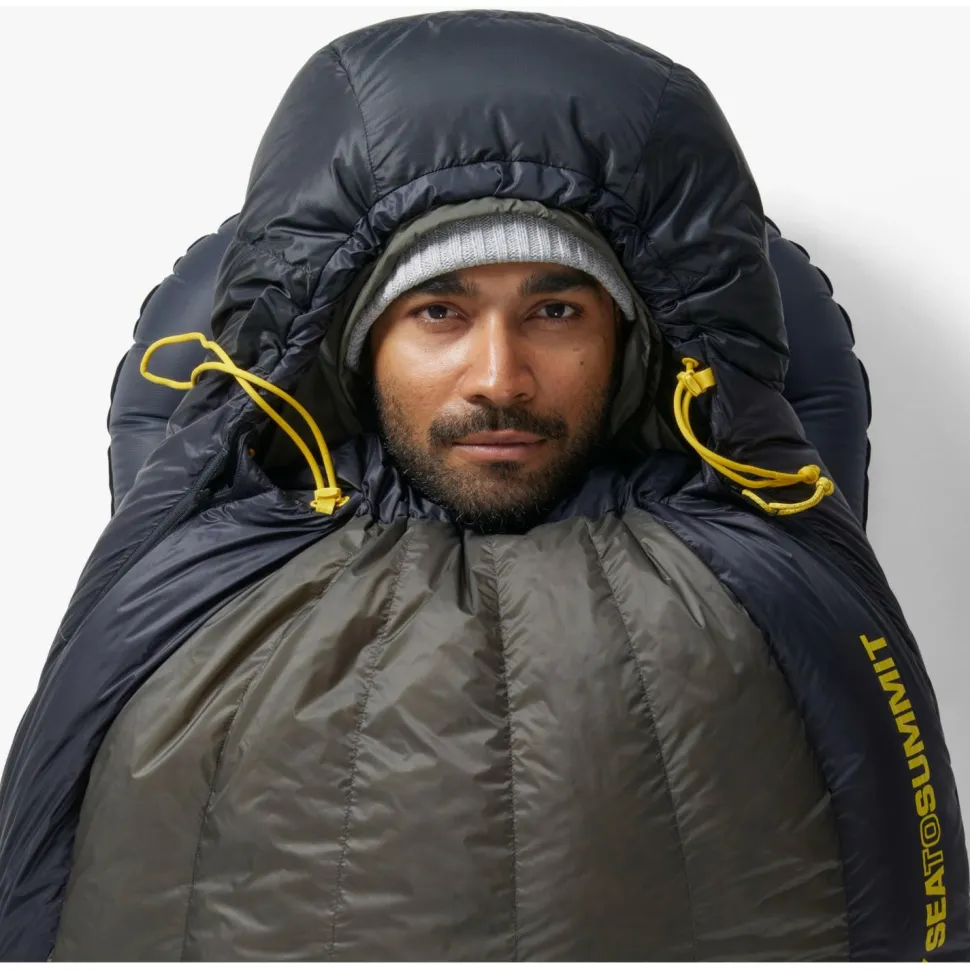 Der Mumienschlafsack ist zwar angepasst geschnitten, lässt Dir aber durch die großzügige Fußbox Platz in diesem Bereich. Und die technische, vergleichsweise tiefe Kapuze bietet Dir sowohl beste thermische Isolationsleistung als auch gemütlichen Komfort. Darüber hinaus ist der Spark Pro -1° koppelbar sowohl mit den frauenspezifischen Schlafsäcken als auch den Quilts von Sea to Summit. Schließlich bietet vorne ein ergonomisch geformter Wärmekragen zusätzlichen Schutz.