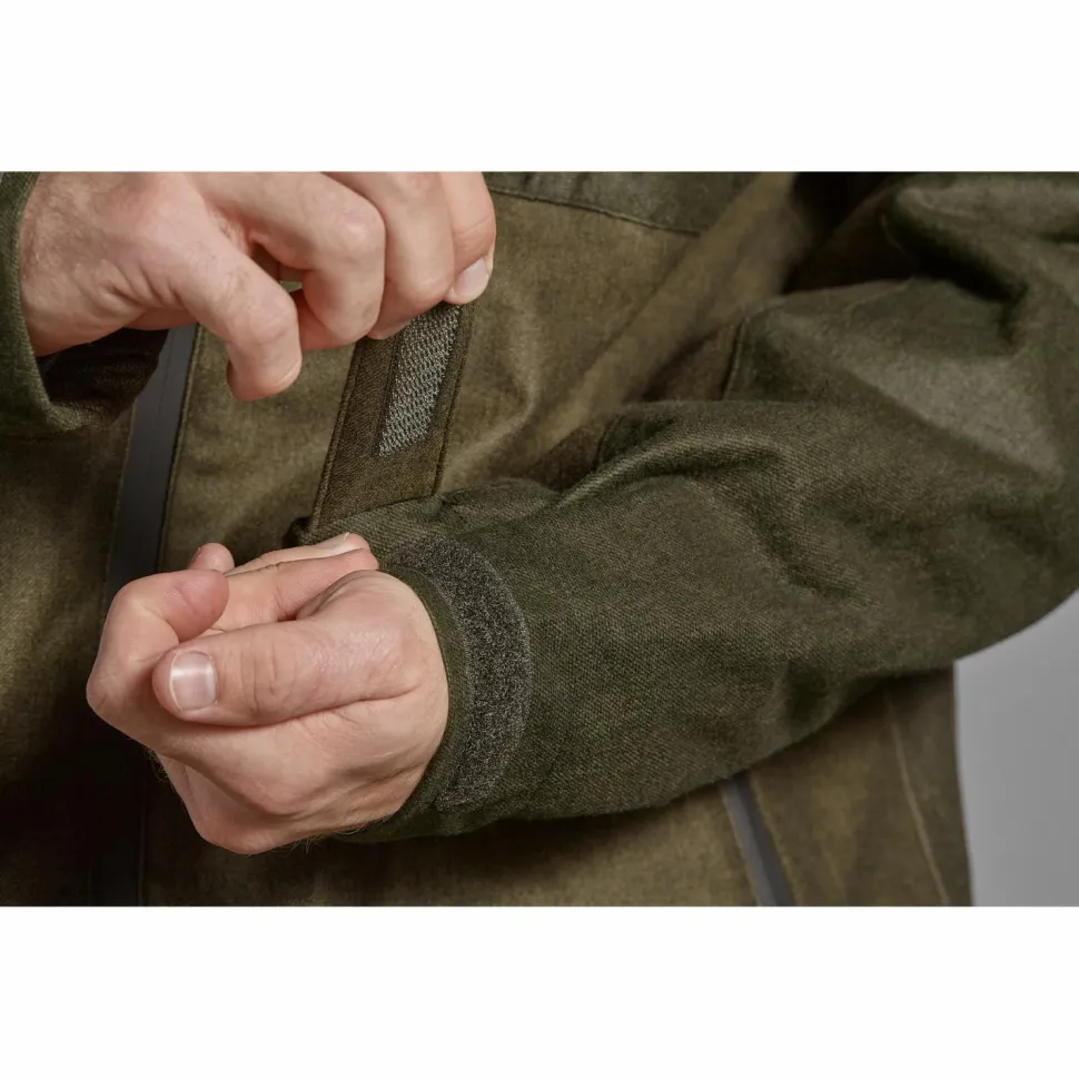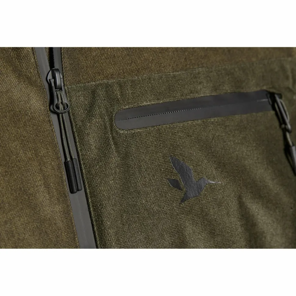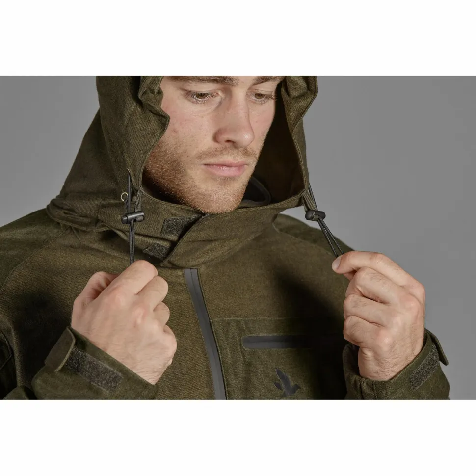 Die Avail Jacket von Seeland ist eine geräuscharme und wetterfeste Jacke. Dank ihrer SEETEX-Membran ist die Jacke wasserdicht, winddicht und gleichzeitig atmungsaktiv. Auch der 2-Wege-Frontreißverschluss sowie die Reißverschlüsse an den beiden Fronttaschen und der Brusttasche sind wasserabweisend, sodass auch an diesen Stellen so schnell keine Nässe durchdringen kann. Um Deinen Hals zusätzlich vor kaltem Zugwind zu schützen, hat die Jacke einen Stehkragen mit einem weichen Innenmaterial. Die Klettverschlüsse an den Ärmeln kannst Du zudem enger stellen, sodass kein kalter Wind hineinbläst. Abgerundet wird die Avail Jacket durch ihre Kapuze. Diese kann vorne und am Hinterkopf jeweils mit einem Kordelzug individuell angepasst werden. Außerdem hat sie einen integrierten Schirm, der den Regen aus Deinem Gesicht fernhält und ist darüber hinaus abnehmbar, falls Du sie einmal nicht benötigen solltest.