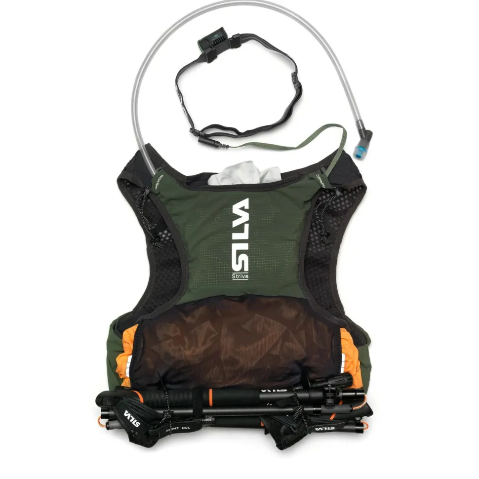 Mit einem Packvolumen von fünf Litern ist die Strive 5 Laufweste sehr leicht und schlank, obwohl sie über eine herausragende Ausstattung mit vielen sinnvoll platzierten Taschen, Fächern und Halterungen verfügt. Zu den Taschen gehören neben Front- und Netztaschen zwei vordere Reißverschlusstaschen und eine Trinkblasen-Rückentasche, in der sich wiederum eine Akkutasche mit Kabelausgängen befindet. Bewegliche und verstellbare Fixiergurte gibt es nicht nur für die Laufstöcke, sondern auch Trinkflaschen und Trinkhalme. Sogar für die Stirnlampe hat die Strive 5 Vest eine spezielle Fixierung auf der Brust!