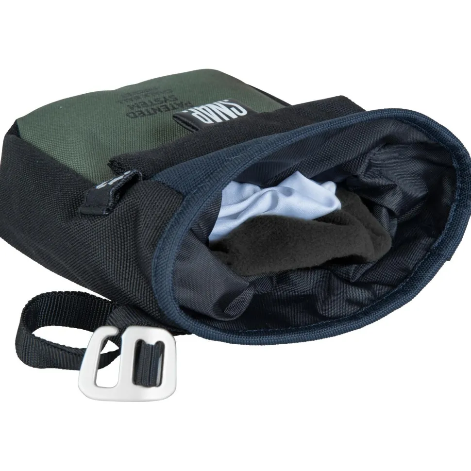 Das Chalk Pocket Scratch der französischen Kletter-Spezialisten von Snap ist ein klassisches Chalk Bag, mit dem traditionellen Kordelzug-Verschluss, und einem integrierten Gürtel zum Tragen des Beutelchens. Aber Snap wären nicht sie selber, wenn es nicht wenigstens ein paar kleine Special-Features gäbe, et voila: das Teil kommt mit Bürstenhalter, und einer mit einem Reißverschluss gesicherten Tasche, in der Du dein Smartphone, den Schlüssel, Geldbeutel oder Ähnliches verstauen und immer bei Dir haben kannst. Hergestellt aus recyceltem Polartec Fleece.