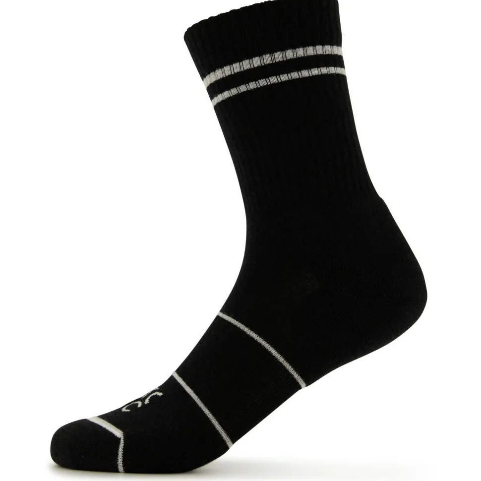 Die Merino Crew Tech Rib Stripes Socks von Stoic sorgen mit viel Merinowolle und weich gepolsterten Zehenspitzen und Fersen auch bei langen und mehrtägigen Wandertouren für einen möglichst hohen Komfort. Die Merinowolle sorgt für ein ausgewogenes Mikroklima und hemmt Gerüche. Meistens reicht es, die Socken über Nacht auszulüften, damit sie am nächsten Tag wieder einigermaßen frisch riechen. In Kombination mit den formstabilen und schnelltrocknenden Kunstfasern erhältst Du ein Paar funktionale Wandersocken für Deine nächsten Outdoorabenteuer!