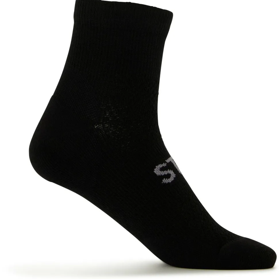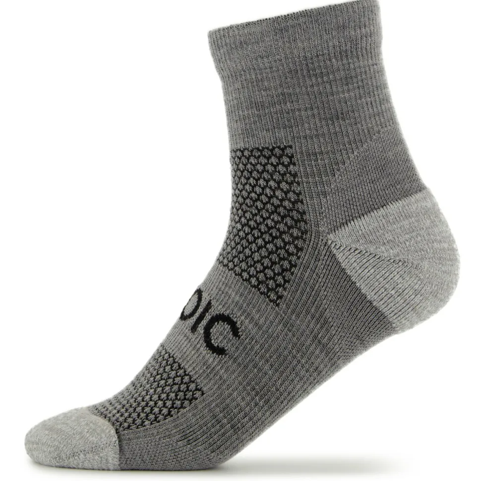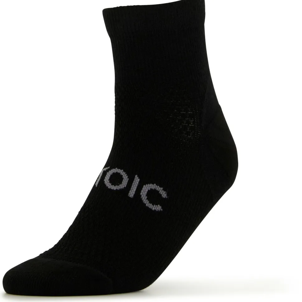 Die Stoic Merino Running Quarter+ light socks unterstützen Deine Füße beim Lauftraining. Zehen und Fersen sind extra gepolstert, wodurch Druckstellen und Blasenbildung vorgebeugt wird. Zudem sorgen Belüftungszonen am Mittelfuß für eine gesteigerte Atmungsaktivität. Durch den relativ hohen Wollanteil besitzen die Socken nicht nur ein natürliches Tragegefühl, sie hemmen auch die Bildung von unangenehmem Gerüchen, weshalb sie auch nach dem Lauf noch ziemlich frisch riechen und einfach ausgelüftet werden können. Der Schaft liegt eng an, reicht bis über den Knöchel und sorgt für einen festen Sitz. Mit diesen Socken bist Du für das Lauftraining ideal ausgestattet!