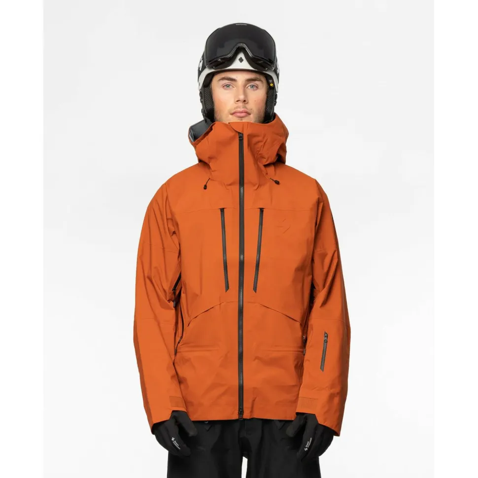 Die Crusader GORE-TEX Pro Jacket bietet viele kleine Features, die auf dem Berg einen echten Unterschied machen. Dazu gehören integrierte Handgamaschen mit Daumenlöchern, ein abnehmbarer Schneefang mit Silikongrip und mehrere Taschen, die sinnvoll verteilt sind: Zwei leicht zugängliche Brusttaschen, eine laminierte Innentasche für Wertsachen und eine Skipasstasche am Ärmel. Die Bedienung ist dank griffiger Zipper auch mit Handschuhen kein Problem.