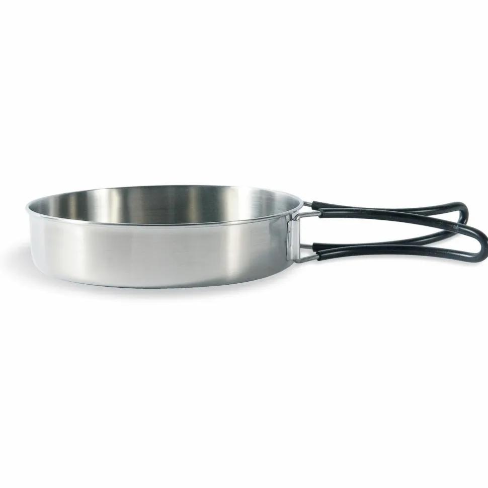 Outdoorköche und Köchinnen aufgepasst: das Cookset Regular von Tatonka bereichert die Campingküche! Das fünfteilige Edelstahl Kochset besteht aus einer Pfanne, einem 0,9 Liter Topf mit Deckel und einem 1,3 Liter Topf mit Deckel. Beide Töpfe und die Pfanne sind mit praktischen Klappgriffen versehen. Ineinander gepackt passt das Set platzsparend in den mitgelieferten Packbeutel.