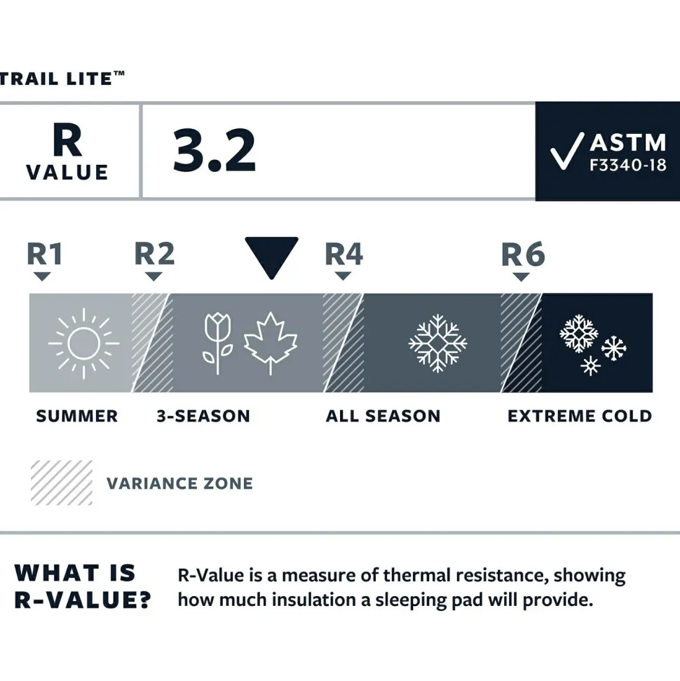 Die Trail Lite Isomatte von Therm-a-Rest überzeugt mit ihrem hohen R-Wert von 3,2. Damit isoliert sie auch in alpinen Biwaks und bei Temperaturen bis –11 °C effektiv. Das Außenmaterial der Trail Lite Isomatte ist aus robustem Ripstop-Polyester gefertigt, sodass Du die Trail Lite Isomatte auch auf steinigen Untergrund legen kannst, ohne Dir Sorgen machen zu müssen.