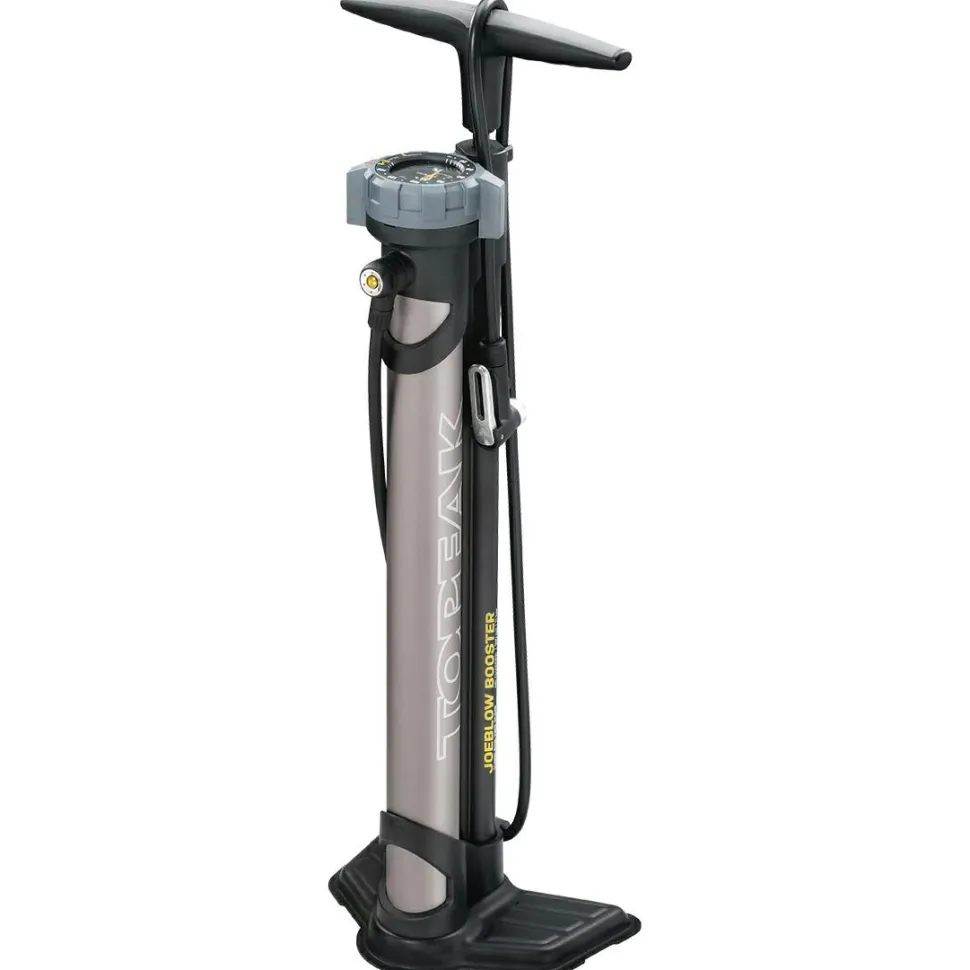 Die JoeBlow Booster Standpumpe von Topeak ist eine Mischung aus Luftkompressor und Standpumpe. Sie ist mobil und der Luftdruck lässt sich feinregulieren, sodass man sie wie eine herkömmliche Pumpe benutzen kann. Der Griff ist gummiert und sie hat einen extra langen Schlauch, so bequem war Aufpumpen noch nie!