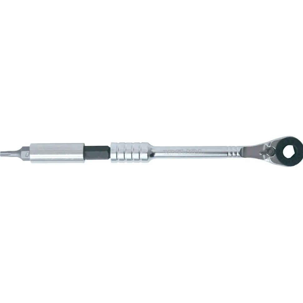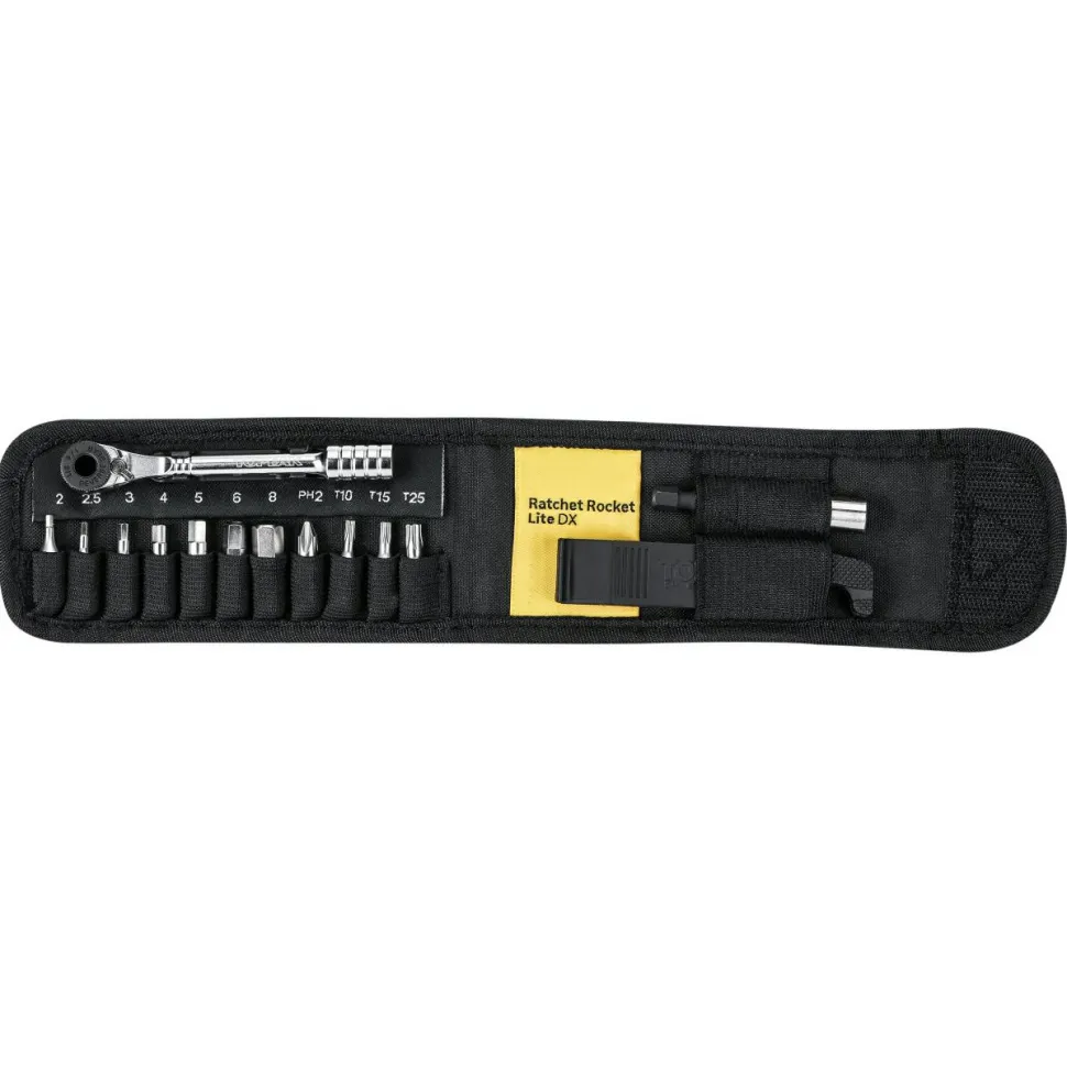 Das RatchetRocket Lite DX von Topeak ermöglicht auch unterwegs ein sauberes und präzises Arbeiten am Bike. Dank der umschaltbaren Ratsche lassen sich Schrauben ganz bequem anziehen oder lösen. Für schwer erreichbare Stellen ist eine Bit-Verlängerung im Set enthalten. Weiterhin befinden sich die gängigsten Bits und zwei Reifenheber im Lieferumfang. Alle Teile sind übersichtlich und zugänglich in einer robusten Nylontasche verstaut, welche Du entweder in der Sattel- oder auch in der Trikottasche verstauen kannst.