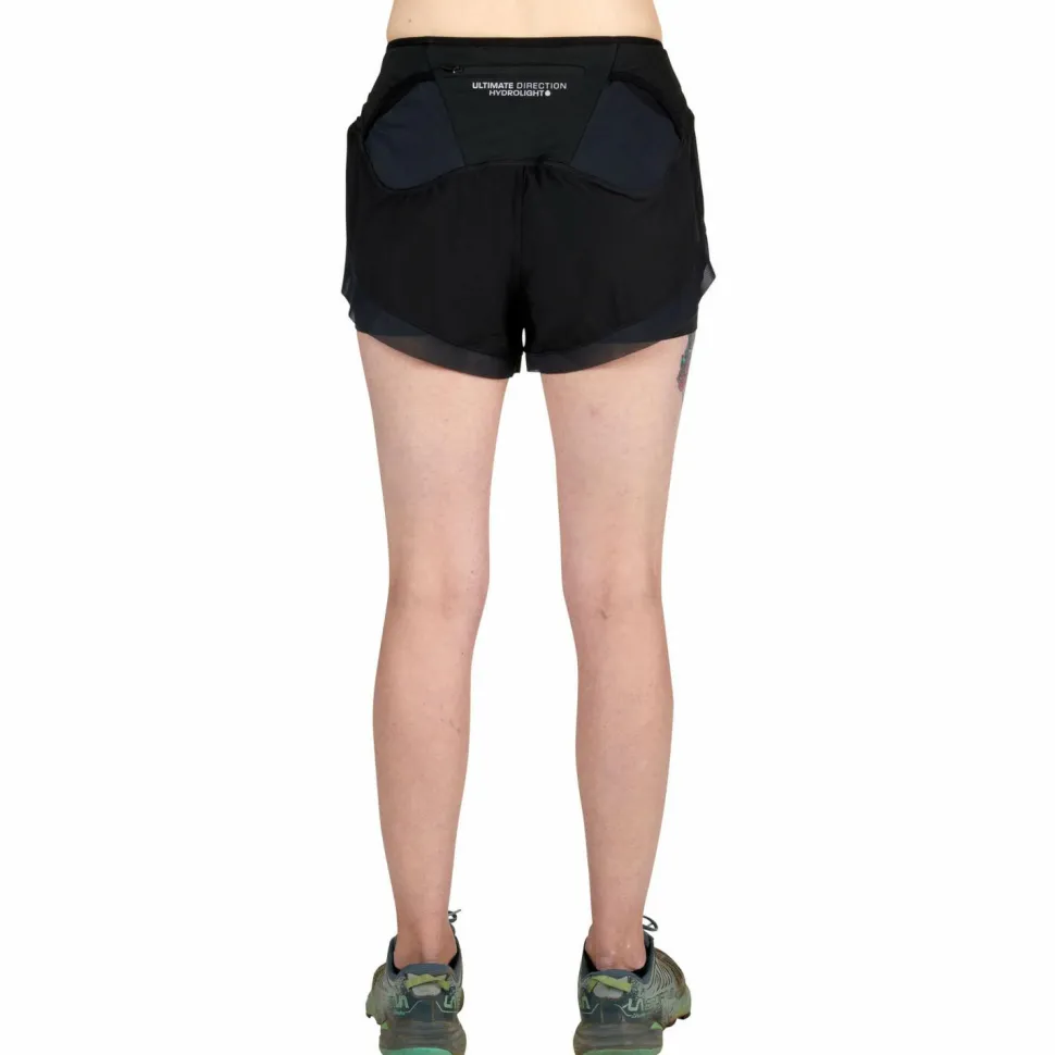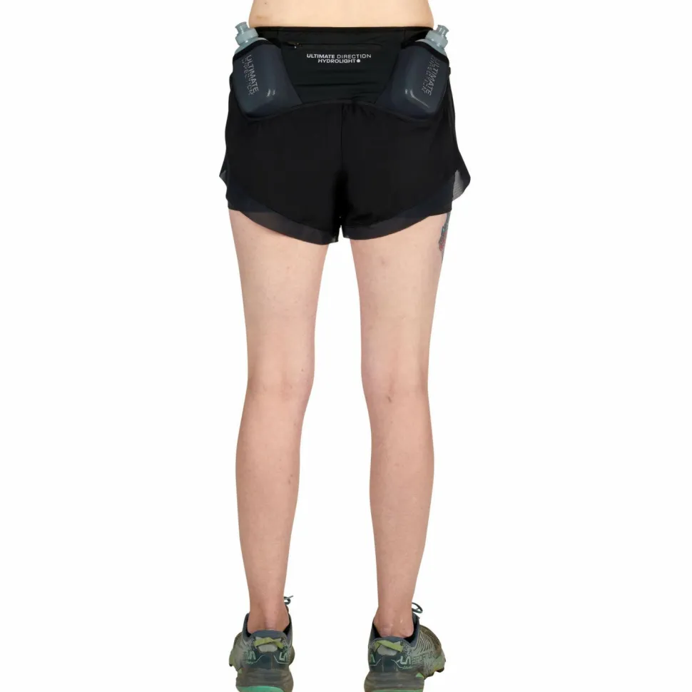 Schnell und leichtgängi, auch mit Ausrüstung: die Women’s Hydro Shorts von Ultimate Direction! Die ausgeklügelte Laufshorts mit Mesh-Innenslip wartet mit einem integrierten Stauraum für die mitgelieferten Wasserflaschen sowie einer Rückentasche für Snacks, Jacke oder andere Utensilien auf. Dank des Hydro Hammock-Futters, des Zwei-Wege-Stretch-Meshs sowie der exakten Taillenregulierung scheuert auch bei schnellem Lauf nichts und es fliegt kein Material umher. Zudem ist diese integrierte Lösung atmungsaktiver als die herkömmliche Kombination von Laufgürtel oder Laufweste mit normaler Hose. Perfektioniert wird die Women’s Hydro Laufshorts durch ihre magnetische Schnalle für einfaches An- und Ausziehen!