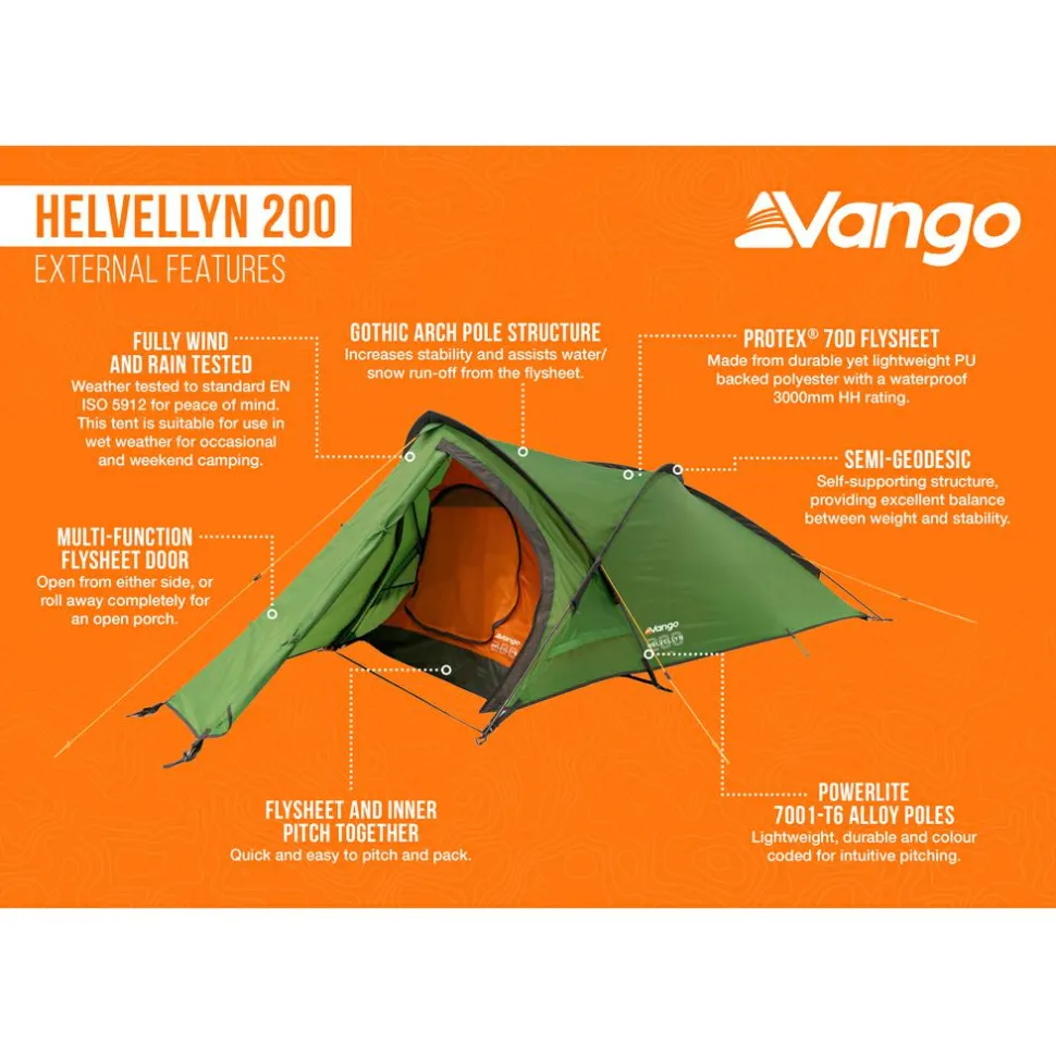 Das Helvellyn 200 lässt sich schnell und einfach aufstellen, da das Innenzelt am Außenzelt befestigt bleibt. Die aus Protex 70D Flysheet-Polyester bestehende Außenhülle ist strapazierfähig und leicht, mit einer wasserdichten 3000mm HH Bewertung. Das PU-beschichtete Bodentuch kommt mit einer Wassersäule von 6000mm. Die farbcodierten Stangen erleichtern den Aufbau, während das Innenzelt aus strapazierfähigem Polyester und atmungsaktivem Mesh für eine gute Belüftung sorgt und die Kondensation reduziert. Die spitz zulaufende „Gothic Arch“ Stangenstruktur erhöht die Standsicherheit nochmals, und erleichtert das Ablaufen von Regenwasser oder Schnee vom Außenzelt.Deine Vorteile im Überblick: