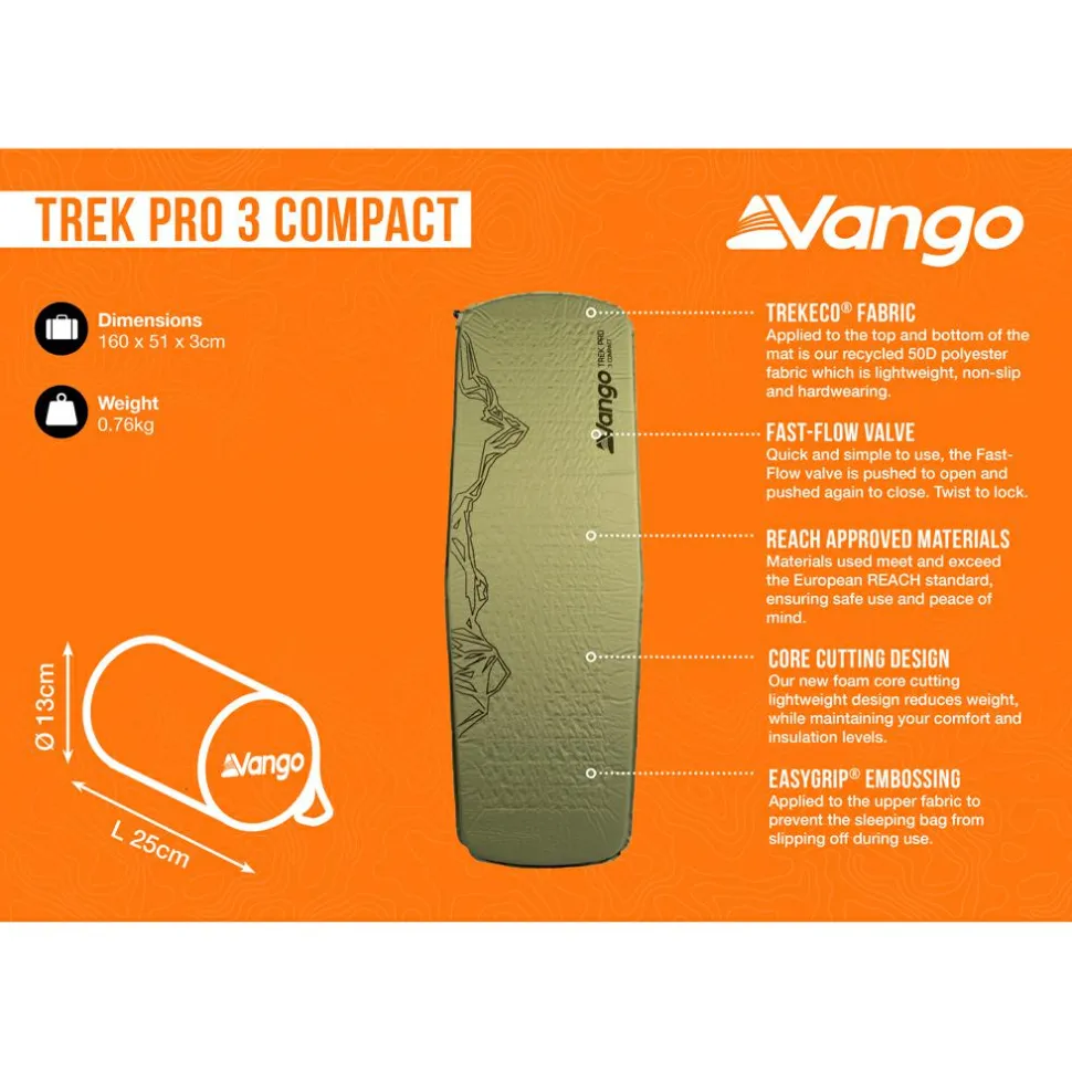 Im mitgelieferten Packsack nimmt die Isomatte nicht viel Stauraum im Rucksack ein. Dank der EasyGrip Beschichtung auf der Oberseite rutscht Du nachts nicht herunter. Das recycelte TrekEco Material macht die Vango Trek Pro 3 Compact zur ersten Wahl für Deine nächste Mehrtagestour in der Natur.
