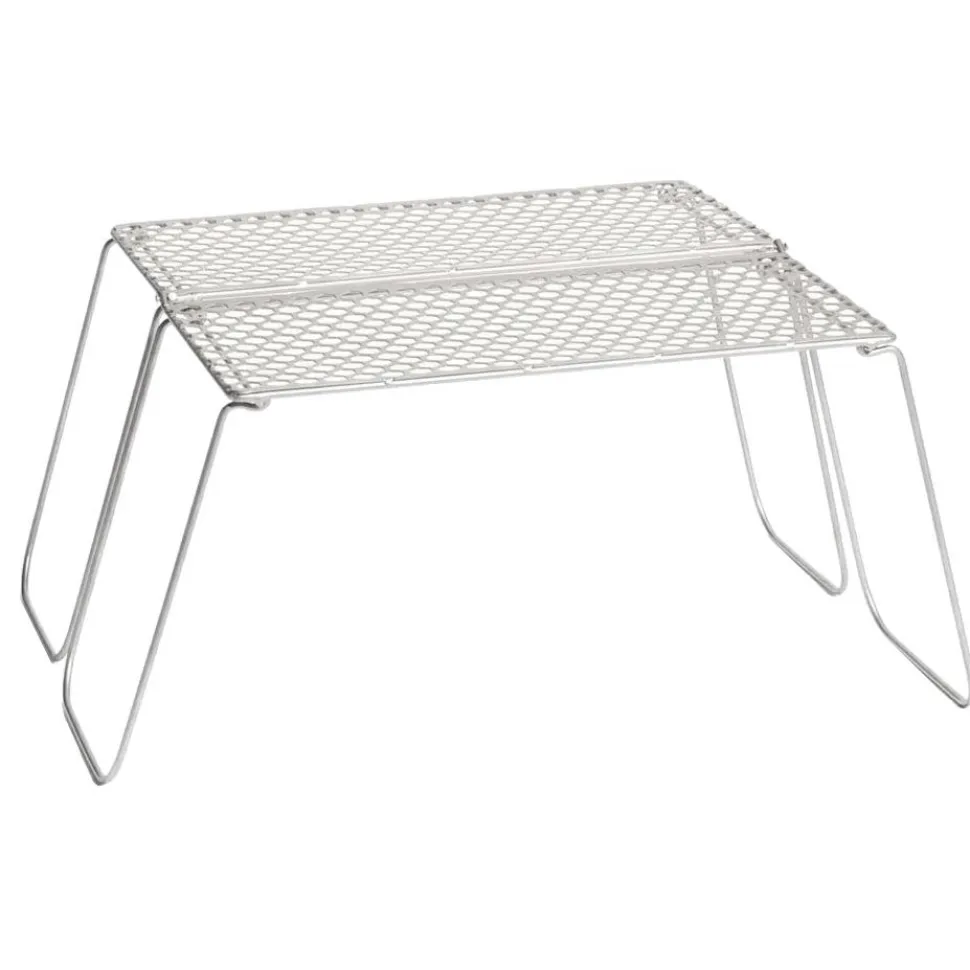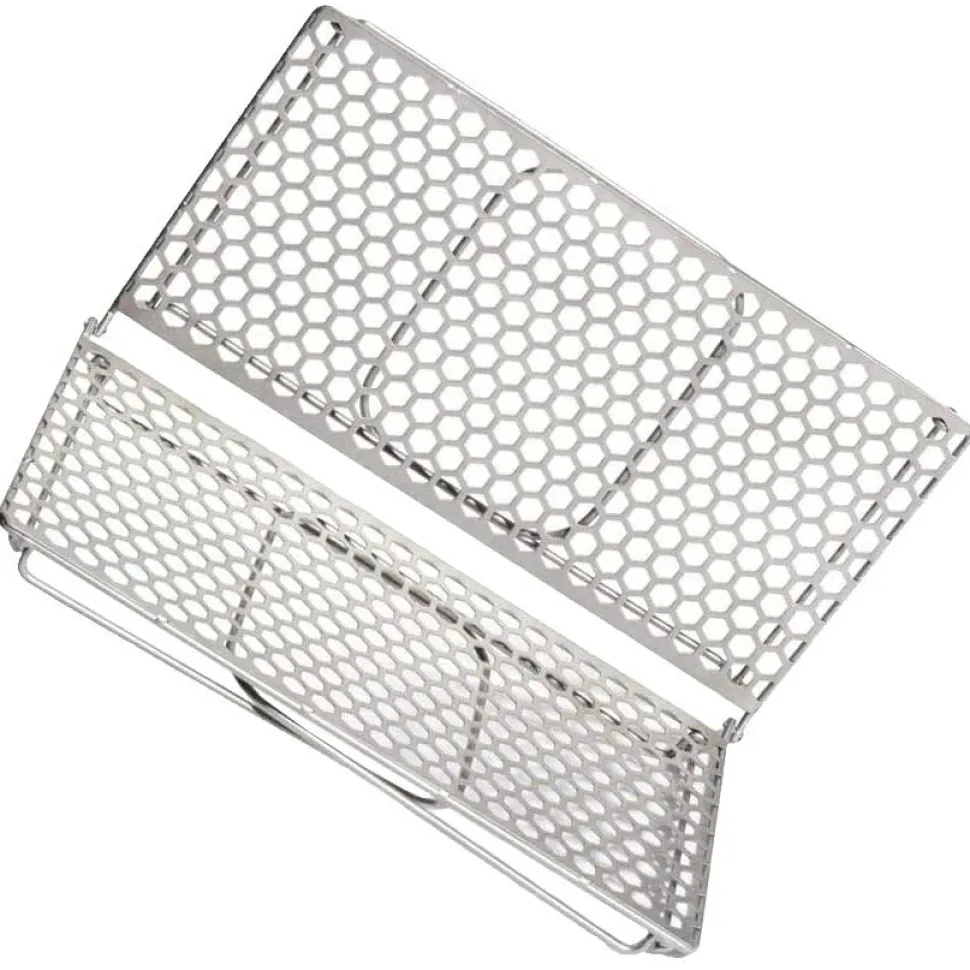Zusammengeklappt kommt er im Rucksack mit zum Picknick oder auf Trekkingtour. Die Wabenstruktur der Grillfläche verhindert, dass beim Grillen kleines Grillgut durch die Gitterstäbe fallen kann (so wie das öfters bei parallel angeordneten Grillstäben der Fall ist). Der Klappgrill wird direkt in die Hitzequelle gestellt.
