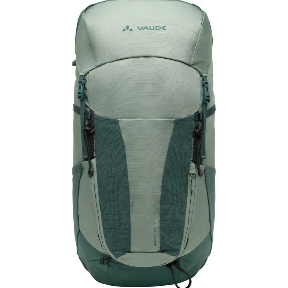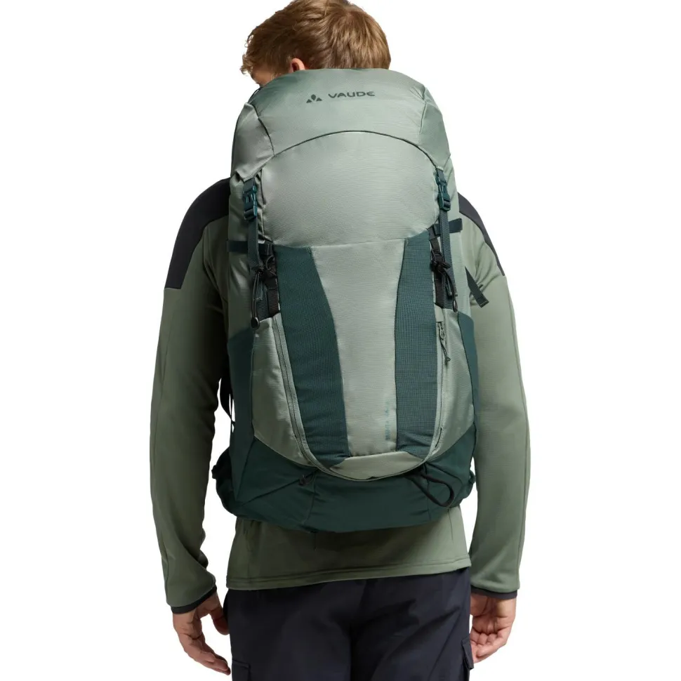 Der Brenta 44+6 von Vaude ist ein sehr geräumiger und top ausgestatteter Wanderrucksack mit ausgezeichneter Rückenbelüftung. Sein individuell anpassbares Tragesystem wird ergänzt durch einen höhenverstellbaren Deckel, der mehr Volumen für Zusatzgepäck schafft. Die ErgoShape-Schultergurte verschaffen mehr Bewegungsfreiheit, während die gepolsterten Hüftflügel für Stabilität und Gleichgewicht sorgen. Schon auf den ersten Eindruck gefällt die praktische Fächeraufteilung und der schnelle Zugriff auf das Hauptfach, der auch per Reißverschluss möglich ist. Dadurch ist das Gepäck jederzeit sinnvoll aufgeteilt und schnell griffbereit.