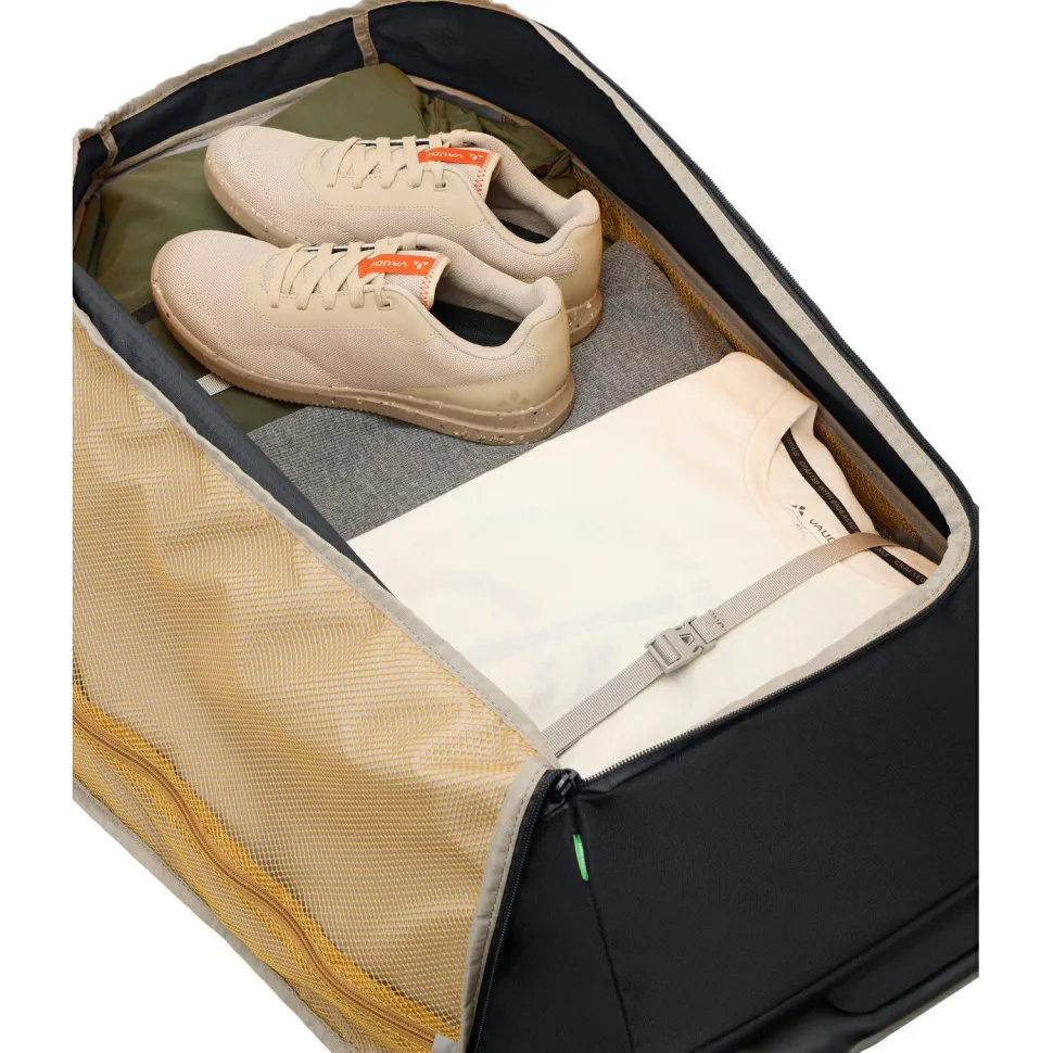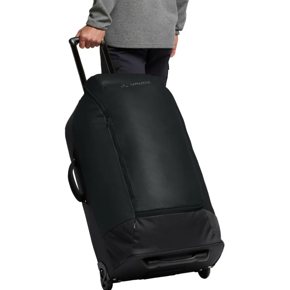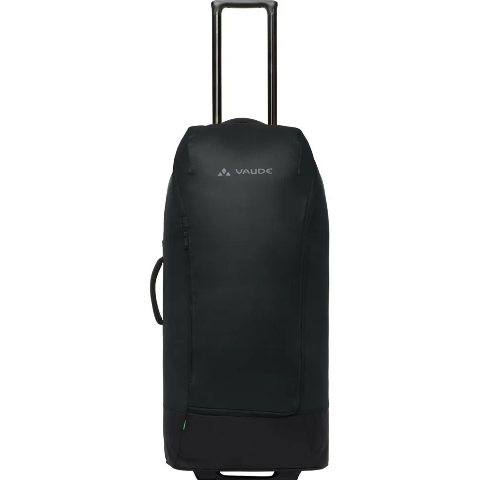 Die Citytravel 90 Reisetasche von Vaude ist die ideale Wahl für ausgedehnte Reisen mit dem Zug oder Flugzeug. Ganze 90 Liter Stauraum bietet die große Tasche und lässt sich dabei mit ihrem Teleskopgriff und den leichtgängigen Rollen mühelos transportieren. Ein seitlicher Tragegriff und ein weiterer Tragegriff auf der Kopfseite sorgen für einfaches Ein- und Ausladen vom Kofferraum, Gepäckfach oder Gepäckband. Der robuste Trolley ist besonders verstärkt und mit einer wasserabweisenden PU-Beschichtung ausgestattet. Ein Frontfach mit Reißverschluss und Kompressionsriemen auf der Innenseite komplettieren den praktischen Citytravel 90 von Vaude.