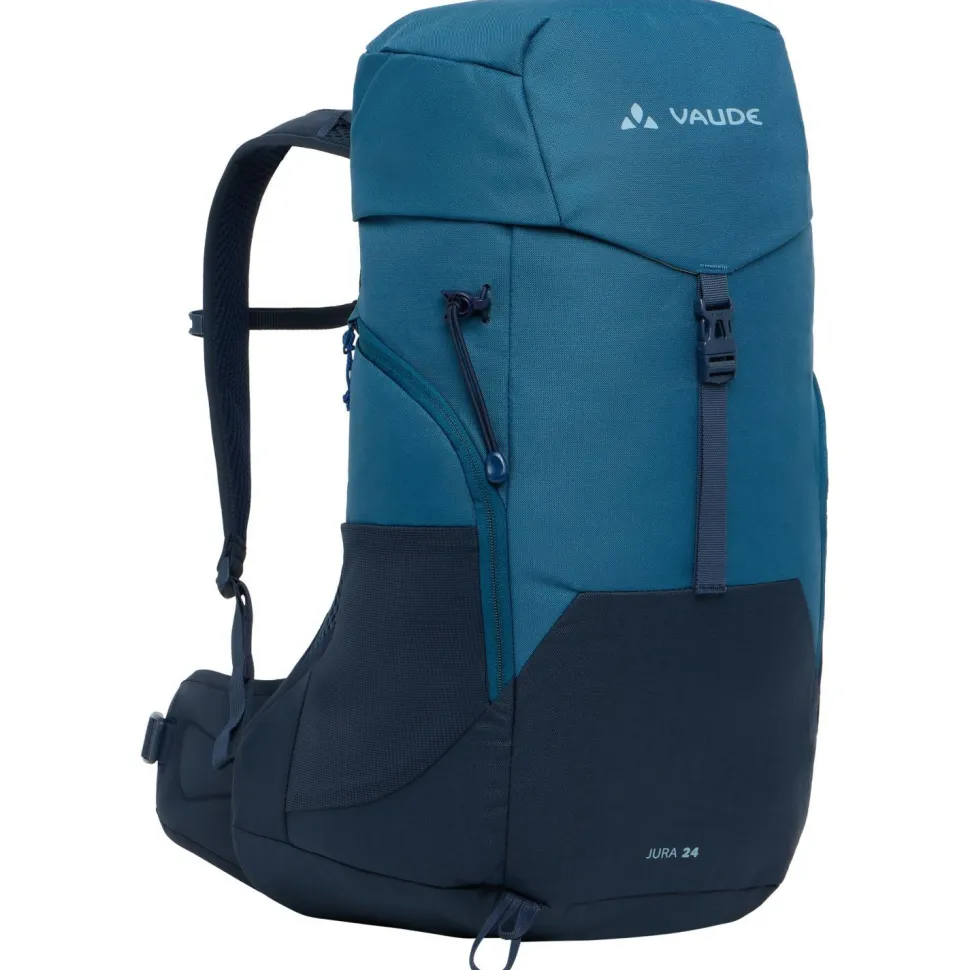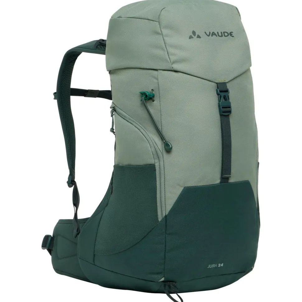 Der Jura 24 von Vaude ist ein kompakter und gut ausgestatteter Wanderrucksack aus ebenso funktionellem wie nachhaltigem Material! Sein von einem leichten Hüftgurt unterstütztes Aeroflex 3D 2.0 Tragesystem belüftet den Rücken permanent von allen vier Seiten und ist sowohl gegen Wärmestau als auch gegen Feuchtigkeitsbildung sehr wirksam. Die ergonomisch geformten Schultergurte tragen dazu die optimale Bewegungsfreiheit und noch mehr Komfort bei. Der zwischen ihnen liegende Brustgurt ist mit einem Trinkschlauchhalter versehen.