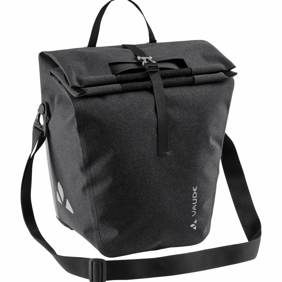 Die ReCycle Back Single 30 ist mit einem Hartschalen-Taschenrücken ausgestattet, der der Tasche eine hohe Stabilität verleiht. Außerdem lässt sie sich mithilfe der integrierten Schnellbefestigungshaken QMR 2.0 leicht vom Gepäckträger lösen, aber auch direkt mit einem Schloss (nicht im Lieferumfang enthalten!) am Fahrrad absperren. Mithilfe des abnehmbaren, verstellbaren Schultergurtes kannst Du die Tasche überall mit hintragen. Dabei verhindert die rotierende Befestigung des Gurtes ein Abkippen. Egal ob auf dem Weg zur Arbeit, zum Einkaufen oder auch zum Picknick – die ReCycle Back Single 30 von Vaude bietet viel zusätzlichen Stauraum am Fahrrad. Das robuste und wasserdichte Außenmaterial schützt den Tascheninhalt zuverlässig vor Regen und Spritzwasser. Der praktische Rollverschluss bietet einerseits zusätzlichen Wasserschutz und andererseits erweiterbaren Stauraum.