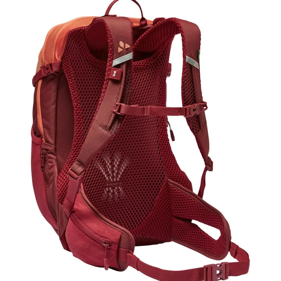 Das Tragesystem ist an den femininen Körperbau angepasst und besteht aus gepolsterten, ergonomisch geformten Schulterträgern, einem Brustgurt mit Befestigungsmöglichkeit für einen Trinkschlauch und einem Hüftgurt. Das 3D-Mesh Rückenteil sorgt für Abstand zwischen Rücken und Rucksack und schafft angenehme Luftzirkulation, auch auf langen und intensiven Touren.