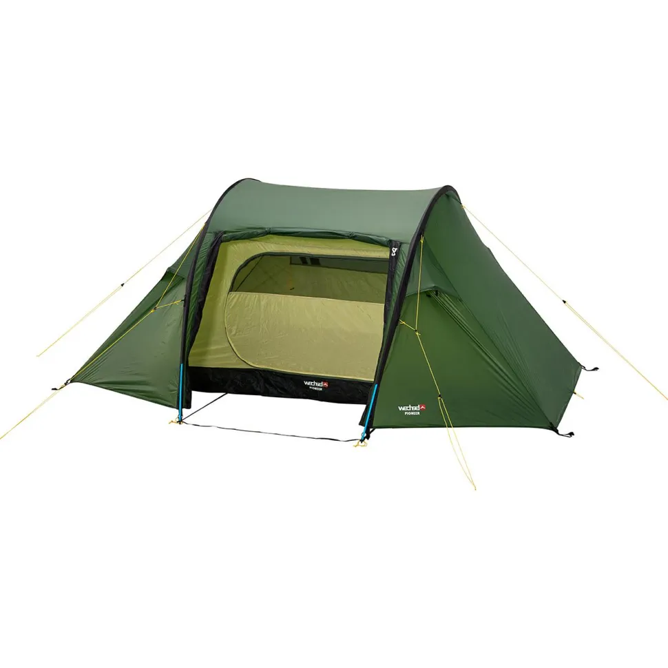 Mit dem Pioneer hat Wechsel ein komfortabel geschnittenes 2-Personen Zelt im Programm, welches sich durch die robuste Konstruktion optimal für Deine nächste Trekkingtour eignet. Auch auf dem Campingplatz weiß das Tunnelzelt zu überzeugen. Das farbig markierte Gestänge erleichtert den Aufbau und es kann nichts falsch zusammengesteckt werden. Reflektierende Abspannleinen verhindern besonders in der Nacht ein Stolpern beim nächtlichen Gang zur Toilette. Verstellbare Schlaufen für die Heringe ermöglichen jederzeit eine optimale Befestigung am Boden. Das Außenzelt ist mit einer wasserabweisenden Silikonbeschichtung gegen Durchfeuchtung geschützt. Durch den langen Schnitt ist das Tunnelzelt auch sehr gut für größere Personen geeignet, die bei anderen Modellen beim Schlafen mit den Füßen ans Innenzelt stoßen.